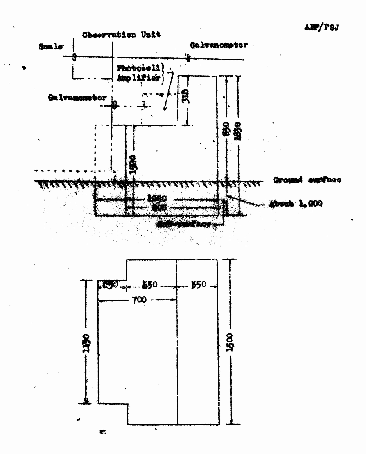 (コンクリート台の高い段と低い段に鋭感検電器(galvanometer)を設置している)