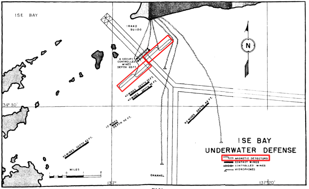 また、伊良湖防備衛所における磁気探知機の配備状況については、戦後に連合軍側が発行した文献により確認することができました。当該文献には伊勢湾における水中防備図が示されており、伊勢湾口に磁気探知機(MAGNETIC DETECTOR)が設置され、伊良湖防備衛所が設置されていた地点に向けてケーブルが延びていることが確認できます。