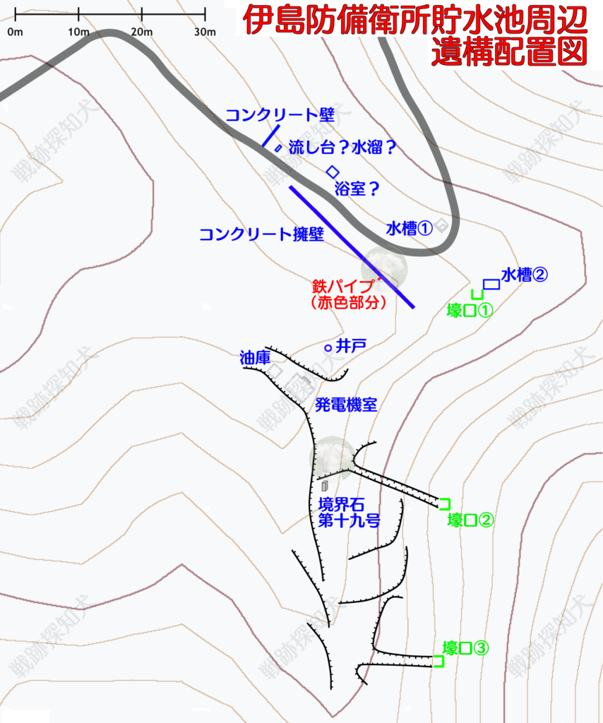 前回もご紹介しましたが、島中央部にある貯水池周辺での遺構の配置図をお示しします。