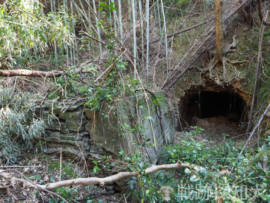 前述のとおり、道路の湾曲部の外側の谷にモルタル製のレンガでできた水槽があり、その水槽のすぐ横に壕口①があります。壕内に入るのが怖いので中には入っていませんが、幅と高さはそれぞれ2m程度です。