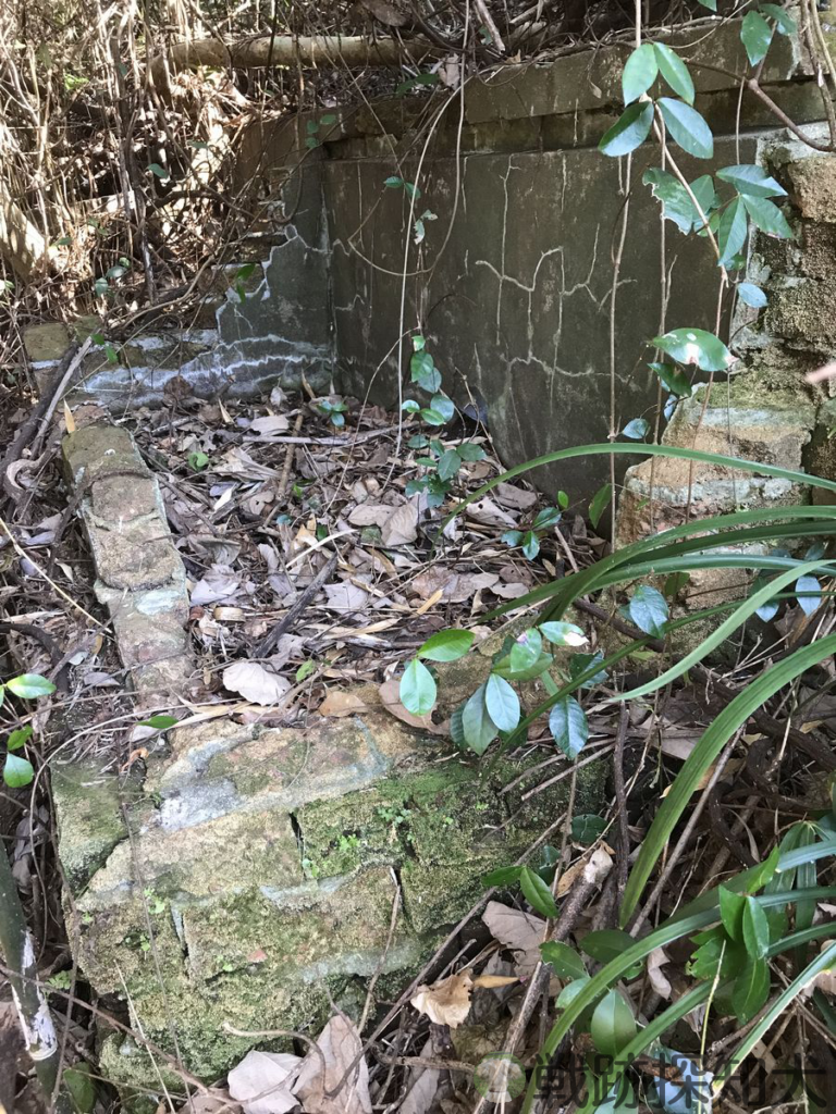 前述のコンクリート壁から道路を数メートル上がった茂みの中に、レンガとモルタルで造られた流し台若しくは水溜のような施設を確認しました。茂みの中にあるため、大きさは計測していません。引渡目録ではこの付近に倉庫が設置されていたとされているため、倉庫の一部である可能性もあります。島に設置されている防備衛所の施設では、建物のすぐ横に水溜が設置されているのをよく見かけます。屋根に降り注いだ雨を集めて、水溜に貯めていたと考えられます。