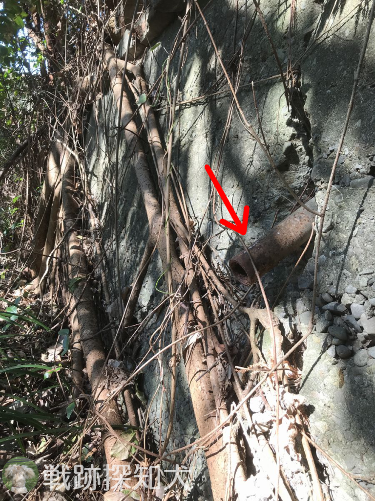 また、このコンクリート擁壁には、埋め込まれた鉄パイプが残置されています。この鉄パイプのサイズ(外径の直径5cm、内径の直径4cm)は、水槽①(道路沿い)の南西側の壁面に突き出ている鉄パイプと同じであり、水槽①(道路沿い)と井戸を結ぶ位置付近にあることから、井戸からくみ上げた水を水槽に送るための配管の一部である可能性があります。仮にそうであれば、このコンクリート擁壁は、道路が整備された際に設置されたものではなく、防備衛所の施設が設置された当時から存在していたことになります。