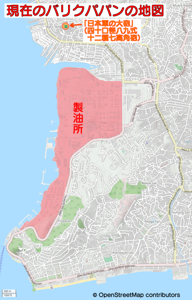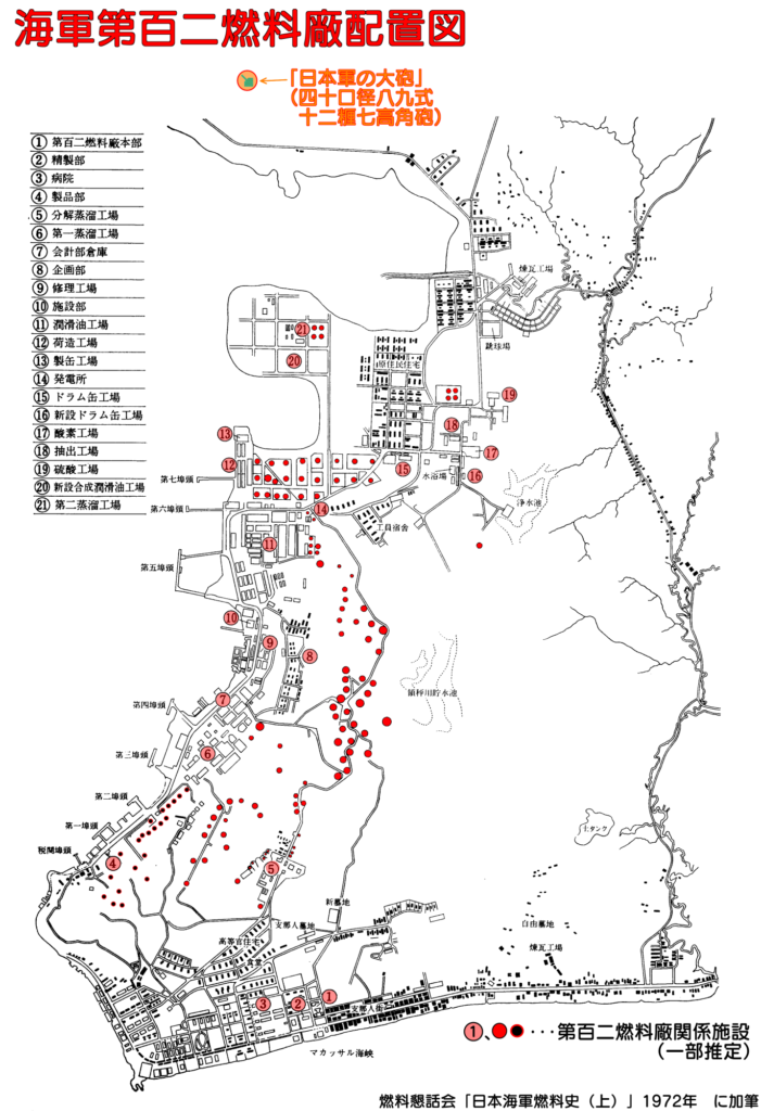 現在、この高角砲の南側には、インドネシアの国営石油会社であるプルタミナの大規模な製油所がありますが、元々この製油所は、インドネシアを植民地としていたオランダが太平洋戦争開戦以前に整備したものです。そして、開戦後に日本海軍がこれを占領し、「海軍第百二燃料廠」として運営していました。海軍第百二燃料廠の配置図と現在の地図を比べると、高角砲の南側の湾が埋め立てられて製油所が拡張されているものの、当時からほぼ同じ規模の製油所が設置されていたことが分かります。この海軍第百二燃料廠を敵機の空襲から守るために、この高角砲が設置されたと考えられます。